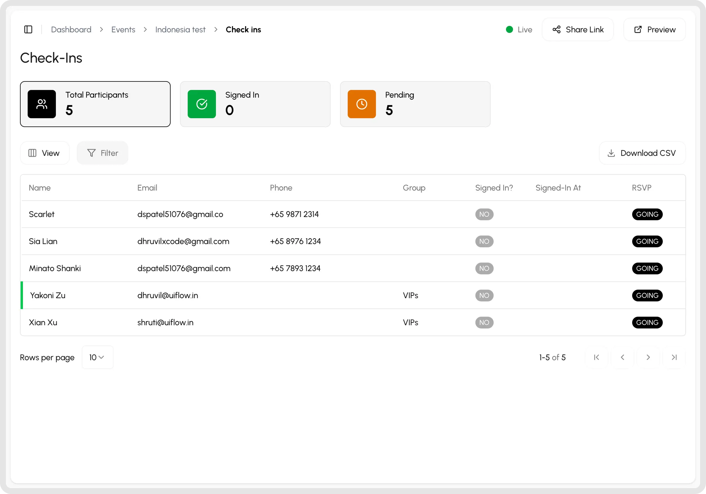 Track sales, check-in numbers, and peak arrival times live from your dashboard.