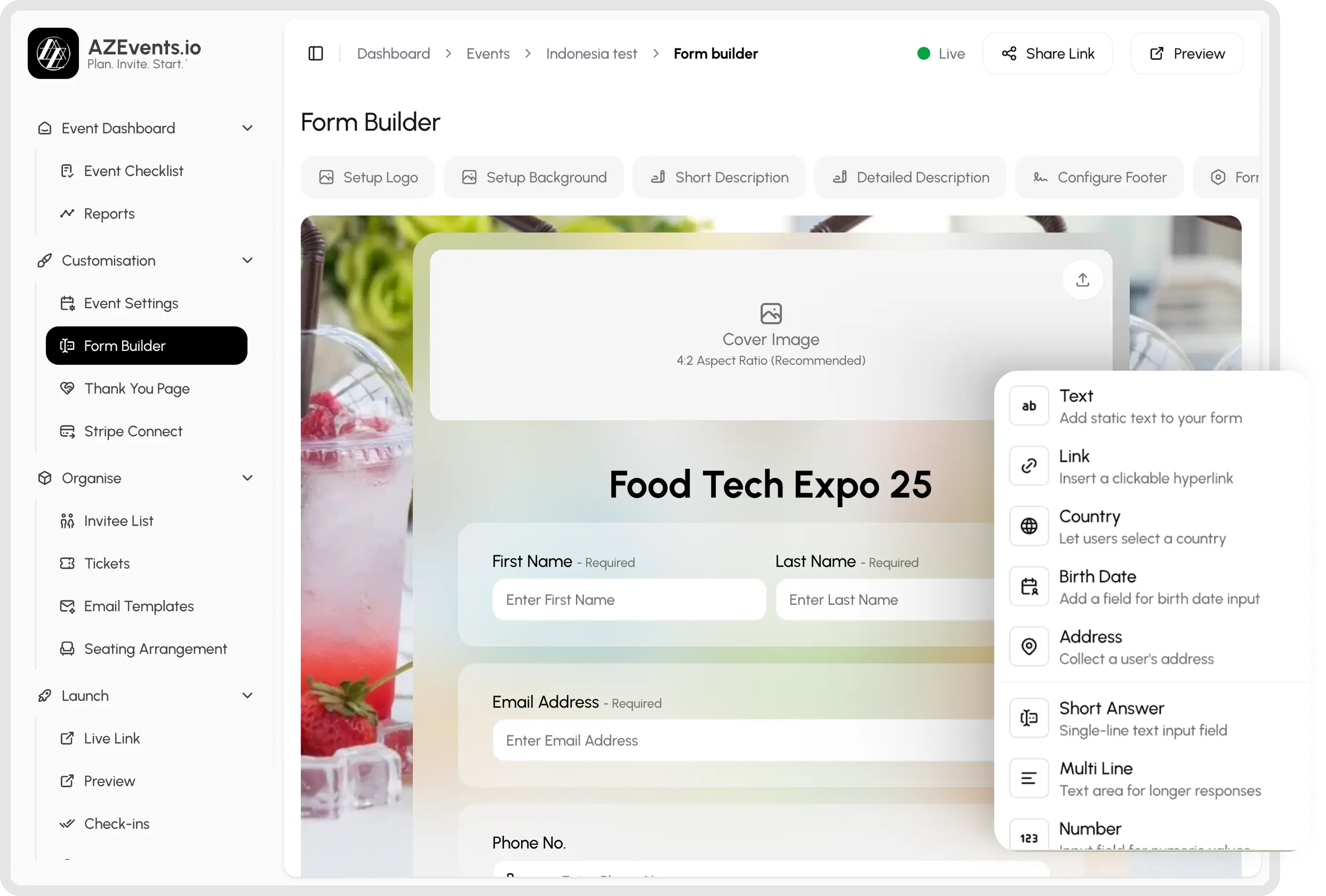 Stop chasing guest details. Create custom registration forms in minutes with our drag-and-drop builder. Collect dietary preferences, t-shirt sizes, or document uploads effortlessly.